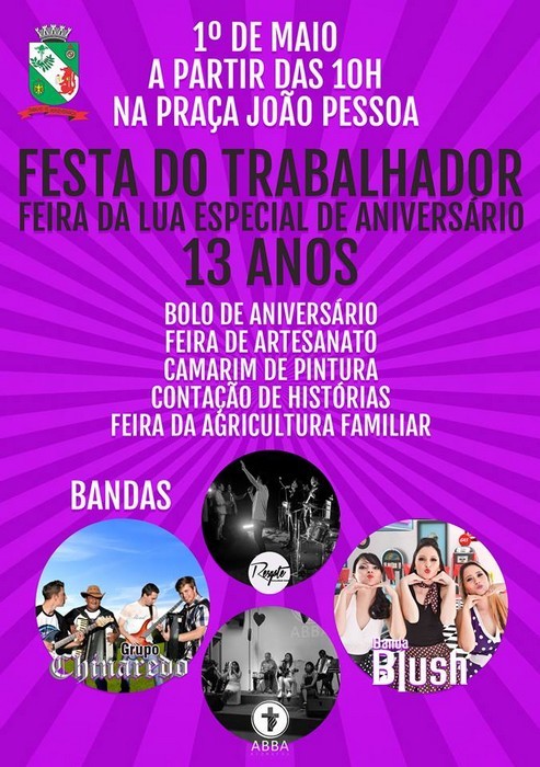 Atrações: A programação inicia às 10h com a Feira de Artesanato, atividades recreativas para as crianças com Contação de Histórias, Camarim de Pintura e brinquedos da Secretaria Municipal de Esportes e Lazer, além da completa praça de alimentação oferecida pela Feira da Lua. A programação musical inicia a tarde, às 15h com a Comunidade Resgate, em seguida às 15h30 a Comunhão Cristã ABBA faz a sua apresentação. Às 16h está prevista a comemoração dos 13 anos da Feira da Lua, com benção, o tradicional “Parabéns” e distribuição de bolo gratuitamente. Logo após, a Banda Blush animará a tarde. O encerramento das festividades será com o Grupo Chinaredo. Clique aqui e saiba mais.