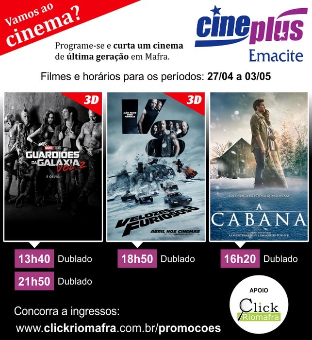 Atrações: Grandes filmes estão em cartaz no Cineplus Emacite. Às 13h40 e 21h50 o cinema exibe o filme Guardiões da Galáxia no formato 3D. O filme A Cabana será exibido às 16h20 e o grande sucesso Velozes e Furiosos 8 às 18h50 em 3D. Todos os filmes são na versão dublada. Clique aqui e saiba mais.