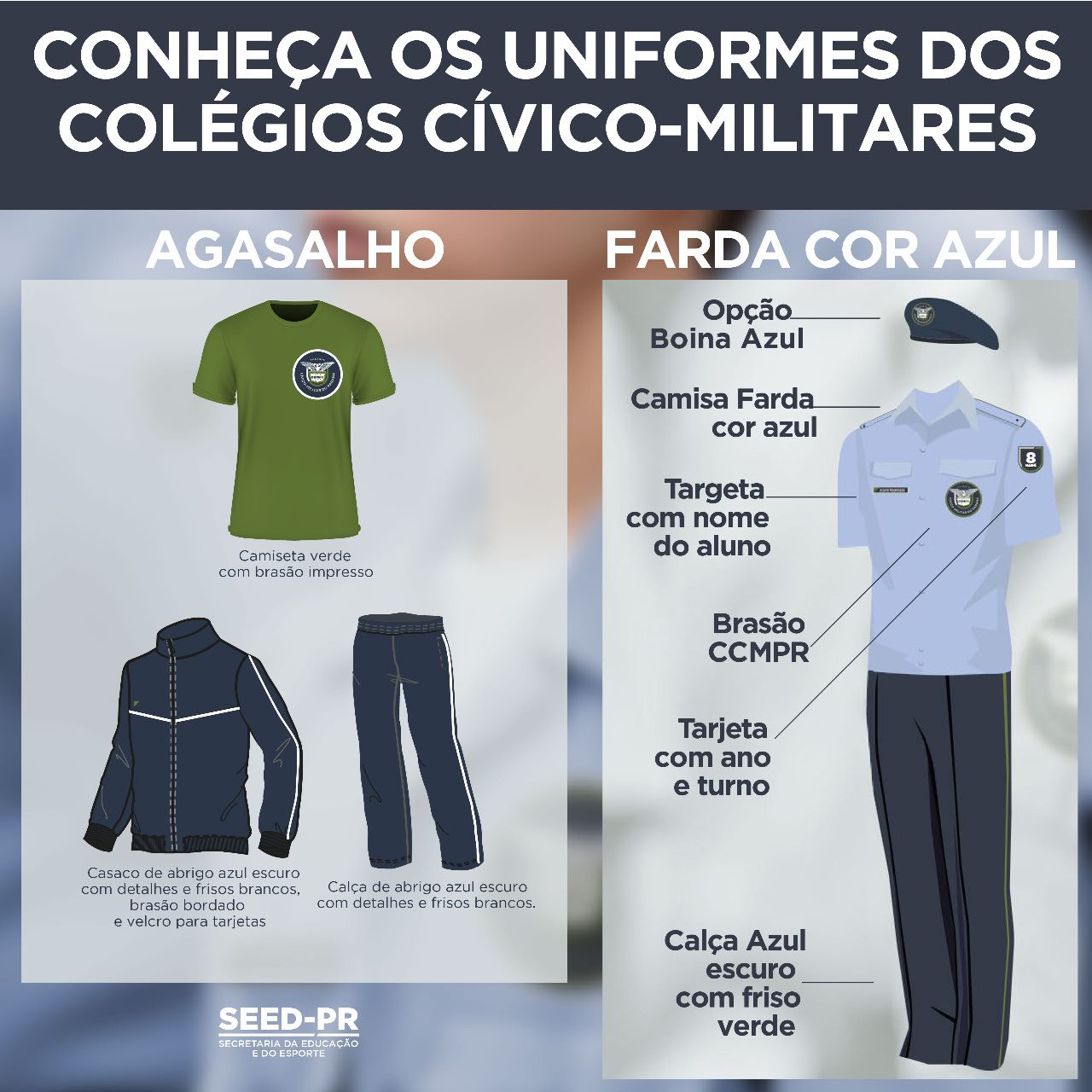 O uniforme dos Colégios Cívico-Militares no Paraná será uma farda azul, de acordo com a Secretaria da Educação e do Esporte (Seed). O modelo da vestimenta foi divulgado pela pasta.
