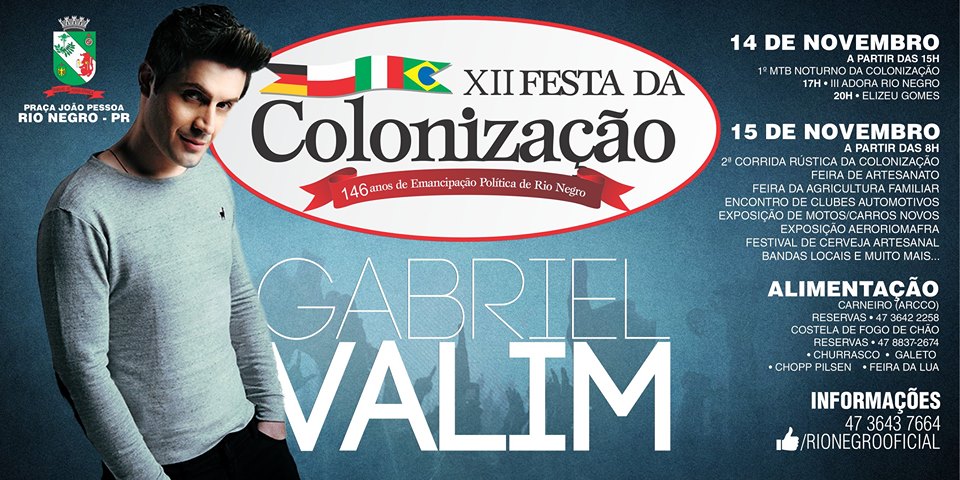 O fim de ano em Rio Negro será repleto de atrações. E para dar início a essa, que é uma das melhores épocas do ano, a prefeitura de Rio Negro, através da Secretaria de Cultura e Turismo, preparou a programação da XII Festa da Colonização. O evento em comemoração aos 146 anos de Emancipação Política do município terá como atração principal o show nacional com o cantor Gabriel Valim. A festa acontece na Praça João Pessoa nos dias 14 e 15 de novembro.