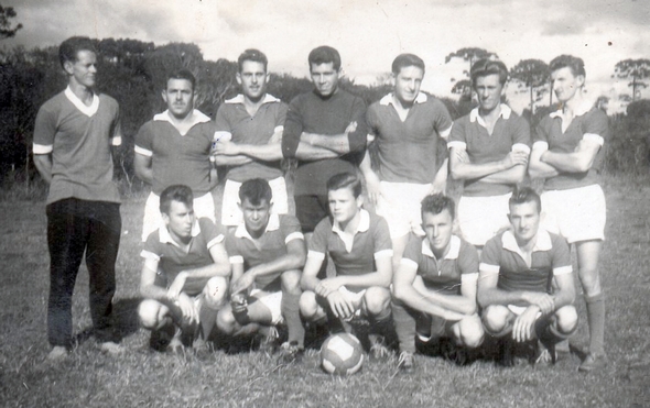 Equipe do Palmeiras no antigo Campo Alegre, há 51 anos. Da esquerda para direita (em pé): João Mendes, Tidinho, Lori, Jair Estoco, Barão, Eco e Álvaro. Agachados: Amauri Bauer, Roberto, Néne Hubner, Néne Cavalheiro e Guito. Imagem cedida por: Álvaro Cavalheiro