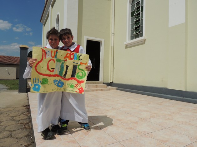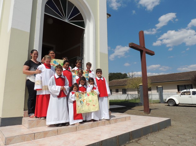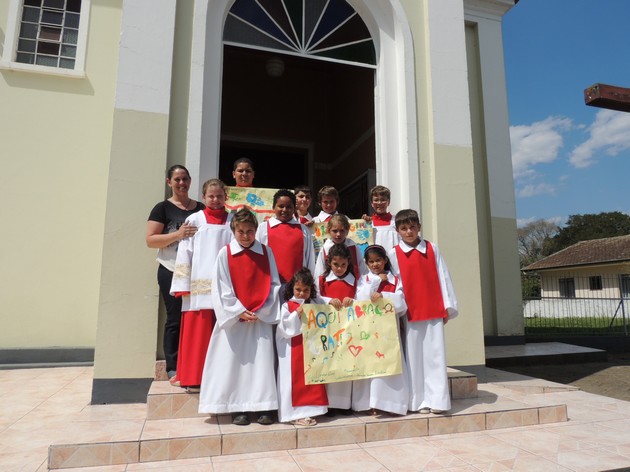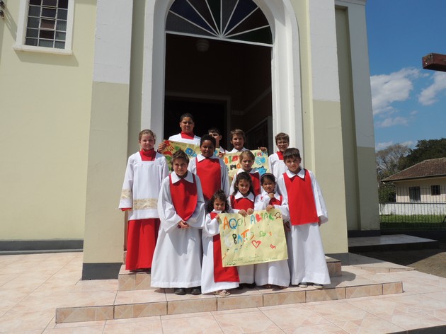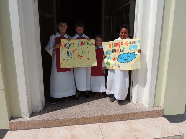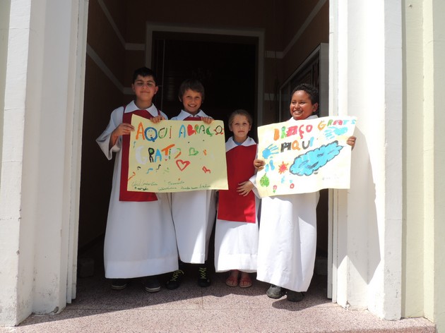 Com cartazes nas mãos e brados de: “Abraços Grátisâ€, 48 coroinhas de 4 a 16 anos, da Paróquia Cristo Rei, pelo menos uma vez por mês, recepcionam os fiéis antes da missa. Segundo a coordenadora geral dos coroinhas, Roxane Trevisan de Oliveira, o Projeto Abraço Grátis, iniciou há 4 meses, com a ideia de envolver os crianças com as atividades da igreja. “É algo diferente chegar na igreja e ser recepcionado pelas crianças, ainda mais com um abraço.â€, pontua a coordenadora ao explicar que o projeto está fazendo o maior sucesso na cidade.