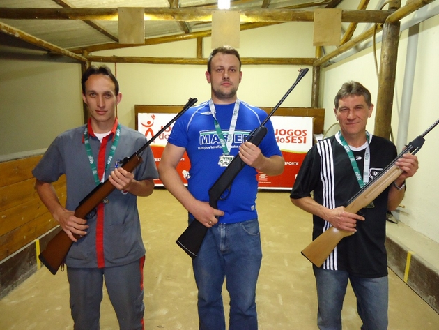 Os três medalhistas do tiro ao alvo masculino, Maicom Peters da Maxicar (medalha de prata); Rafael Chinski da Big Safra (medalha de ouro) e Paulo Wajda da idimex (medalha de bronze)
