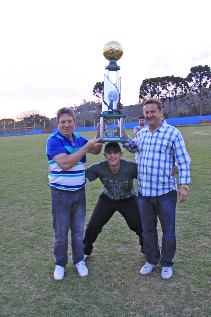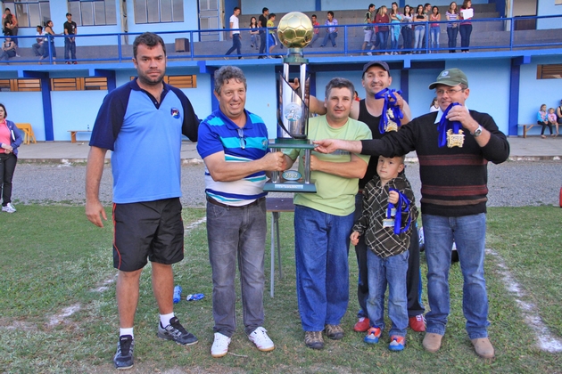 Representantes do Supermercado Belem/Vasco da Gama, recebendo o troféu de campeão, entregue pelo Secretario de Esportes, Paulo Rogério Alves Gaissller