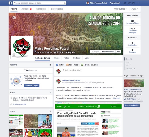 A “fan page†da equipe de futsal Mafra Ferromax (http://facebook.com/mafrafutsal) – referência no agilidade de postagens dos assuntos do time, como por exemplo: informações dos jogos, bastidores, viagens e gols em tempo real – ultrapassa sete mil curtidas, número que coloca a página como a terceira mais procurada no futsal em Santa Catarina.