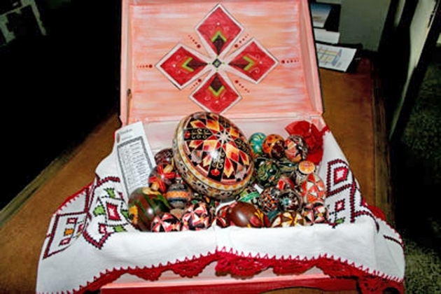 Na própria rodoviária é possivel se familiarizar com o primeiro fragmento da cultura ucraniana: há uma escultura de cerca de dois metros de um imenso ovo todo ladrilhado de pedras. Trata-se de uma pêssanka gigante, rastro da cultura religiosa da Ucrania e simbolicamente associada ao nosso “ovo de Páscoa”. Chama atenção na pêssanka gigante a riqueza de detalhes da pedraria, intensamente colorida e repleta de desenhos que sintetizam o abstrato. É preciso esclarecer que a pêssanka tradicional traz desenhos coloridos sobre ovos de galinha originais e que a sua distribuição acontece durante o periodo de Páscoa.
