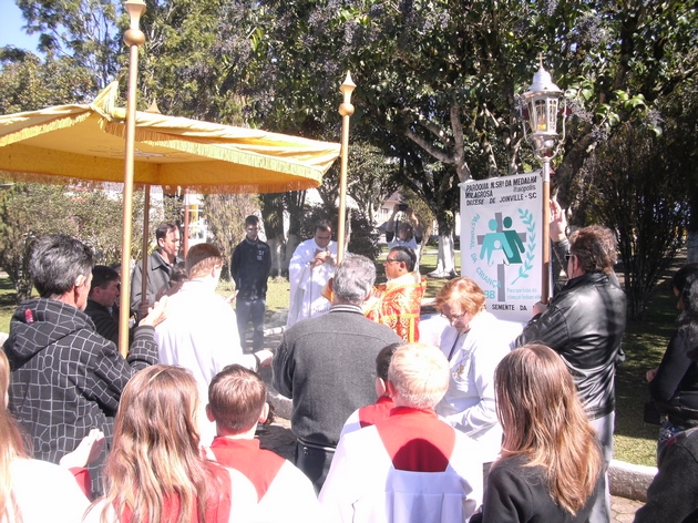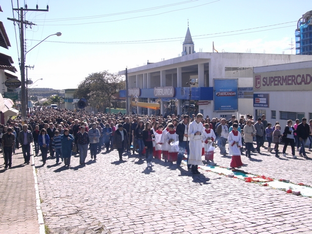 Na última quinta-feira (30) a Igreja Católica de Itaiópolis celebrou o dia de Corpus Christi. A igreja Matriz Nossa Senhora da Medalha Milagrosa, no centro, realizou Santa Missa às 10h e em seguida procissão com a eucaristia, representando o corpo e sangue de Jesus. A cerimônia religiosa foi realizada dentro da nova igreja, ainda em fase de construção. Mesmo com o frio da manhã, os católicos participaram da celebração e não deixaram de confeccionar os tapetes coloridos para a passagem do cortejo.