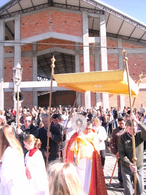 Depois da missa os fiéis seguiram em procissão, onde a eucaristia (corpo de Jesus) é levada no ostensório pelos padres da igreja. Sobre o tapete apenas os padres e o ostensório passaram. A multidão caminhou ao lado, em sinal de respeito.