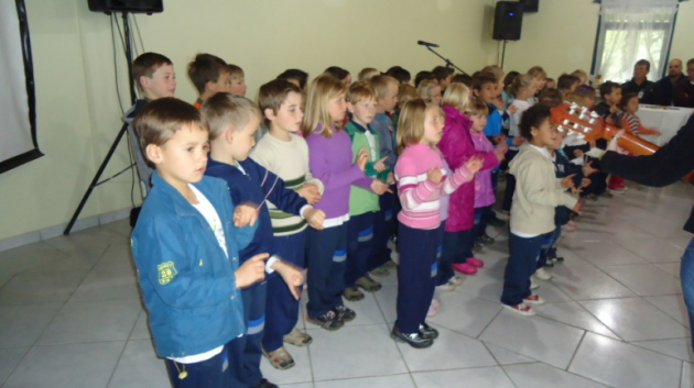 O coral de Alto Paraguaçu composto por 50 crianças também realizou uma apresentação especial na tarde do dia 17 de maio na Associação Desportiva Embraco, durante a abertura da Gincana Ambiental Embraco.