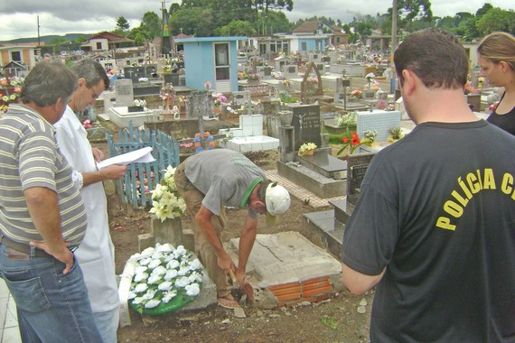 O trabalho, coordenado pela polÃcia civil de Itaiópolis, com apoio do Instituto Geral de Pericias (IGP) da cidade de Mafra, foi realizado no inicio da tarde de quarta-feira (09). A Gazeta de Itaiópolis acompanhou a equipe da pericia, no momento da exumação do cadáver do bebê. Quem fez a coleta de amostras de órgãos e tecidos do recém nascido foi o médico legista do IGP de Mafra Carlos Ricardo Herbst. Após a coleta do material, que foi armazenado em frascos e deve ser encaminhado para o laboratório do IGP em Florianópolis, o médico legista disse que o laudo da necropsia deve sair em até 15 dias.