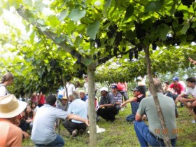 Foram apresentados aos agricultores resultados obtidos para diferentes variedades de frutíferas implantadas no local (pêssego, ameixa, pêra, maçã e uva), bem como abordado aspectos relacionados a manejo, poda, adubação e irrigação destas culturas.