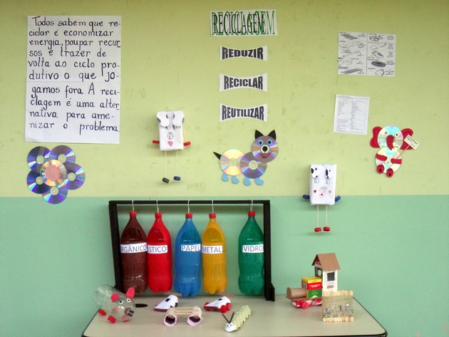 Nesta atividade, segundo a professora, o trabalho desenvolvido tinha como tema o material reciclado, onde os estudantes fizeram a confecção de brinquedos reutilizando o próprio lixo reciclável. Após a confecção, os alunos apresentaram os materiais para os colegas da escola.