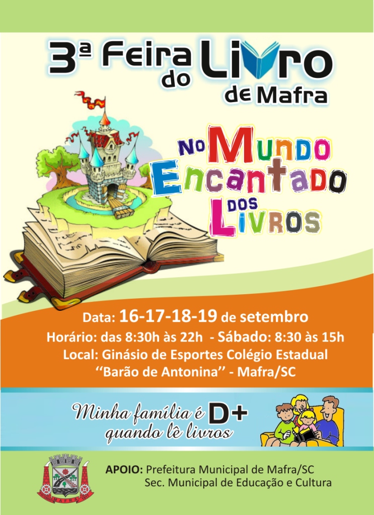 A 3º Feira do Livro com o tema “No mundo encantado dos livros” será realizada entre os dias 16 e 19 de setembro no Ginásio de Esportes da EEB Barão de Antonina. O evento é aberto aos alunos das redes municipal, estadual e particular de ensino de Mafra e Rio Negro com entrada gratuita, a feira faz parte das comemorações do aniversário do município e tem entrada gratuita das 8h30min às 22h, sendo no sábado (19) até as 15h. O evento é uma realização da Prefeitura de Mafra, por meio das Secretarias de Educação e de Cultura.