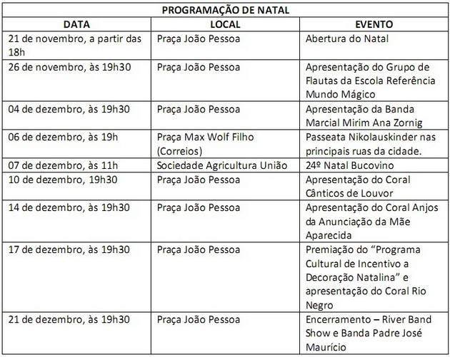 A programação vai contar com carreata saindo da Praça Alemã, no bairro Bom Jesus. A concentração será às 18 horas. A partir das 19h30, na Praça João Pessoa, iniciam as apresentações culturais com a presença do Coral da Sanepar. O Papai Noel estará presente e receberá a chave da cidade, que neste período terá destaque natalino. Às 20h45 está programado o show de fogos de artifício que marcará a chegada do bom velhinho. Todas as crianças poderão encontrar com o Papai Noel no Arquivo Público Municipal, na Praça João Pessoa. Os eventos são gratuitos.