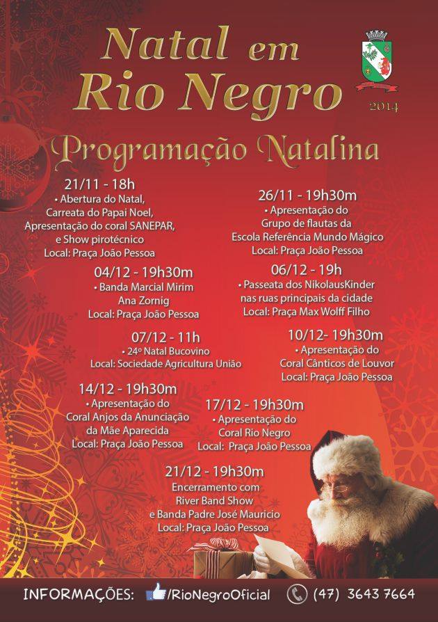 Durante todo o período natalino, vários eventos serão realizados em Rio Negro. Confira a programação: