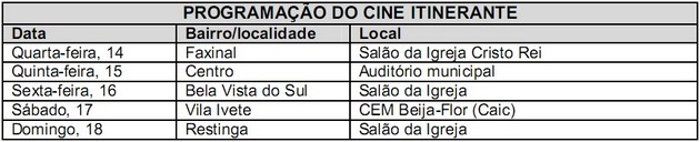Nessa primeira semana a exibição começa na quarta-feira; na quinta-feira, 15, é a vez da Vila Ruthes receber a programação. Na sexta-feira, 16, acontece na Bela Vista do Sul no salão da igreja, no sábado no CEM Beija-Flor (Caic) e no domingo será no salão da igreja da Restinga. O projeto visa divulgar a produção audiovisual nacional e incentivar a formação de platéia.