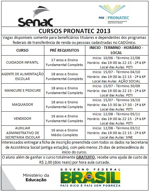 Confira os cursos gratuitos pelo Pronatec a serem realizados em Mafra Publicado por Assessoria - 01/05/2013 - 14h25 Informações: (47) 3634-0602 | www.sc.senac.br - Publicidade -