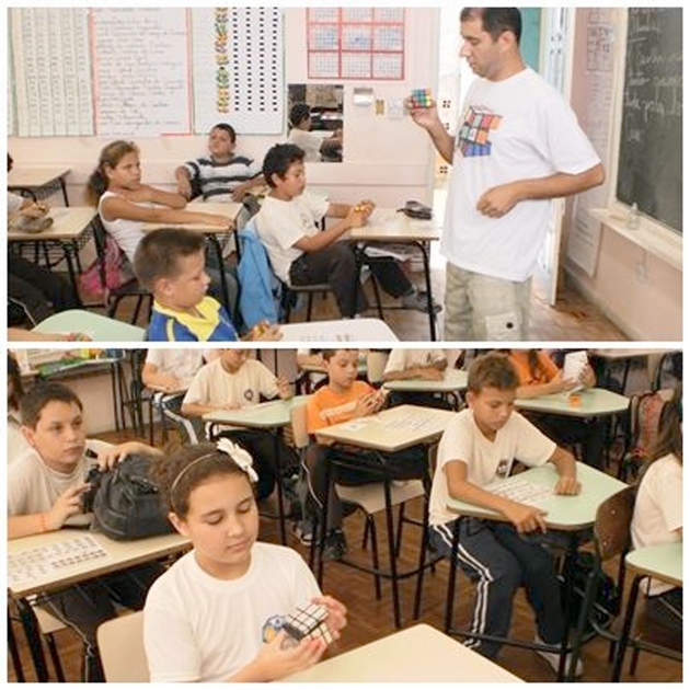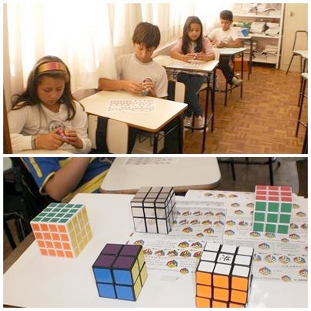 Para instigar o raciocínio, a tentativa, Benjamin Diogo Bruch, juntamente com sua filha Priscila do 4° ano, demonstraram e repassaram um pouco de suas habilidades em montar o “Cubo Mágico “ para os alunos da Escola Municipal Nossa Senhora Aparecida.