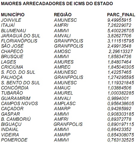 A divisão do ICMS estadual se dá da seguinte forma: dos 100% arrecadados diariamente, 75% fica para o Estado. Os 25% são rateados entre os 295 municípios obedecendo ao seguinte critério: 15% de forma igualitária e os 85% restantes divididos conforme o valor adicionado de cada município gerado pela produção primária, indústria e comércio, geração e transmissão de energia elétrica, transporte rodoviário e ferroviário e telefonia.