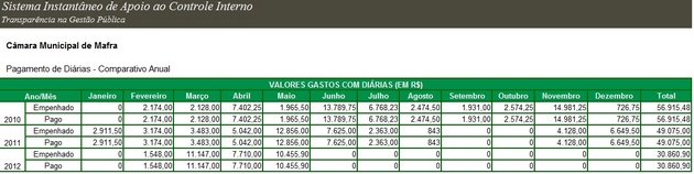 No ano de 2010 inteiro, a Câmara de Vereadores gastou em diárias o valor de R$ 56.915,48. Nesse ano, em apenas quatro meses, já foram gastos R$ 30.860,90, o que demonstra que se as coisas continuarem como estão, o valor será muito superior a 2010.