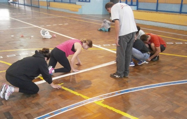 Equipe técnica da Smel refazendo as demarcações da quadra
