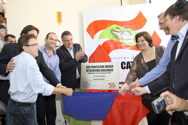 Diretores, professores, funcionários e alunos da EEB Mário de Oliveira Goeldner recepcionaram no início da tarde de segunda-feira o governador João Raimundo Colombo e sua comitiva, composta pelos secretários de Estado da Educação, Eduardo Deschamps; de Desenvolvimento Econômico e Sustentável, Paulo Bornhausen e o secretário de Estado de Desenvolvimento Regional, Wellington Bielecki; os deputados do Estado Sílvio Dreveck e Antonio Aguiar; a sociedade e demais autoridades de Mafra e região, para solenidade de inauguração de uma nova ala, com 650 m² construídos e mais o Ginásio de Esportes, com investimento de R$ 1,5 milhão.