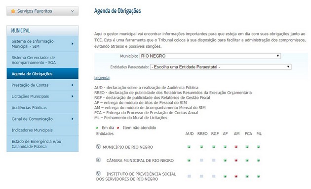 A Prefeitura de Rio Negro, Câmara de Vereadores e o Instituto de Previdência Social dos Servidores estão com a prestação de contas do Sistema de Informações Municipais – Acompanhamento Mensal (SIM-AM) atrasadas desde o mês de fevereiro do ano passado, pelo menos é o que consta no site do Tribunal de Contas, até o fechamento desta matéria.