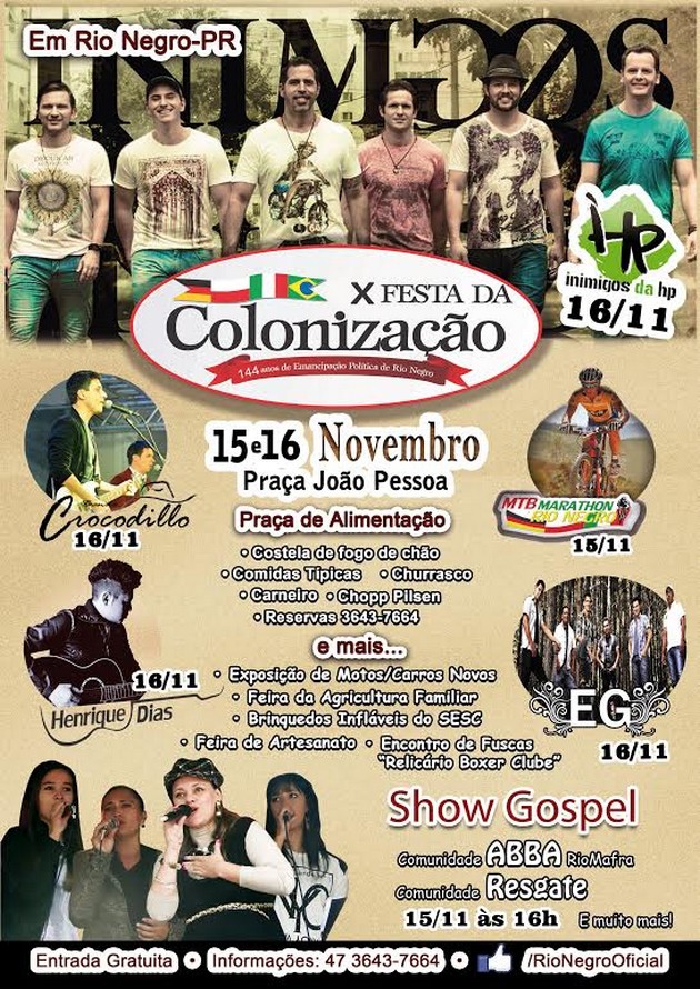 No domingo estão programadas a partir das 12h, apresentações das bandas regionais Crocodillo, Evolução Gaúcha e Henrique Dias. O encerramento contará com a apresentação do Show Nacional “Inimigos da HP”. O início do show está previsto para as 21h. A entrada é livre. Participe!