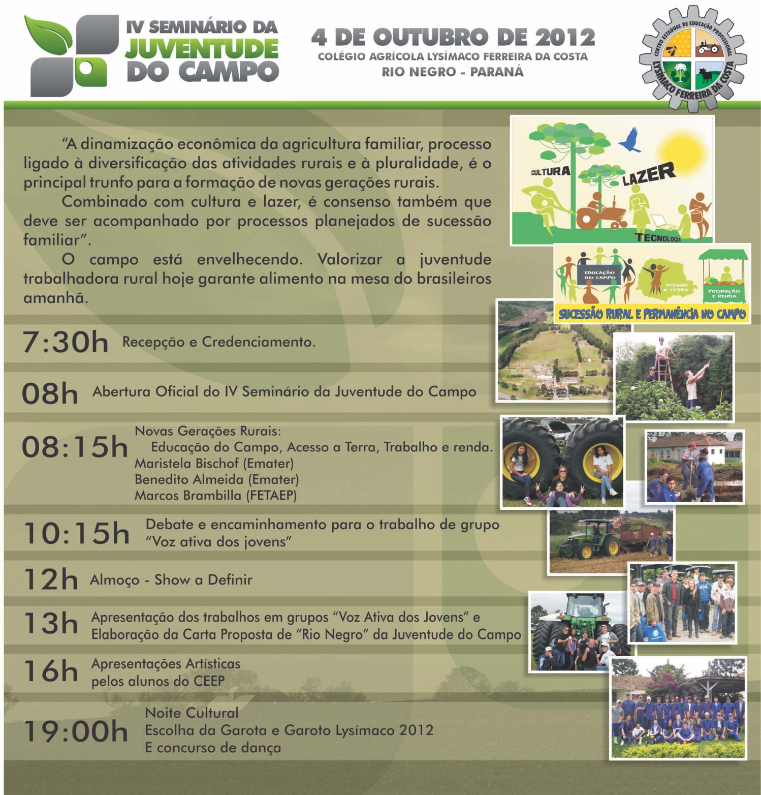 “Valorizar a juventude trabalhadora rural, hoje garante alimento na mesa dos brasileiros amanhãâ€. Com esse slogan, o Colégio Agrícola Lysímaco Ferreira da Costa realiza, no próximo dia 04 de outubro.