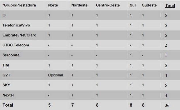Tais prestadores deverão manter conselhos em todas as regiões geográficas em que tenham pelo menos 50 mil acessos em serviço. Assim, todos os grupos de telecomunicações que cumpram os requisitos acima mencionados, deverão ter, ao menos, um conselho por região do paÃs (norte, nordeste, centro-oeste, sul e sudeste), conforme quadro abaixo: