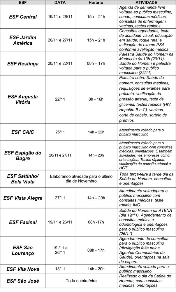 A Secretaria divulgou o calendário de atividades das ESFs relativas ao movimento Novembro azul:
