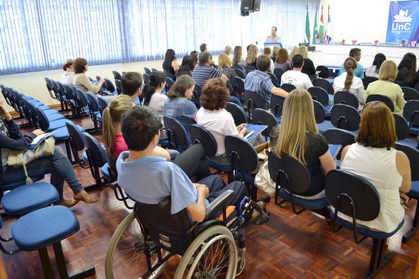 Cerca de 60 pessoas, representando entidades e órgãos públicos, estiveram na UnC para a tarde de trabalho que foi dividido em quatro eixos temáticos, debatidos entre os presentes. O eixo 1 foi educação, esporte, trabalho e reabilitação profissional, com palestra do professor José, da Apae de São Bento do Sul. No eixo 2 foram tratados a acessibilidade, comunicação, transporte e moradia, com palestra da assistente social de Mafra, Maike Steidel.