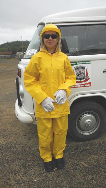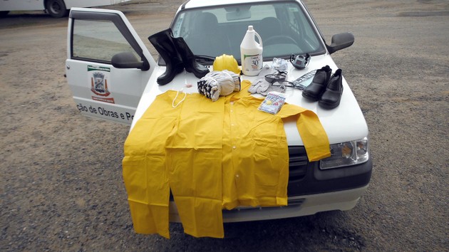 Também foram adquiridas vestimentas para lavação de veÃculos e ônibus escolares utilizados com água de alta pressão, composto por calça e jaqueta, calçados de segurança tipo botina, em couro, com solado em PU, bidensidade colado e blaqueado, com palmilha antibacteriana, bota de PVC injetado, cano longo, solado antiderrapante (para proteção dos pés do usuário em locais úmidos, lamacentos e encharcados), capacete de segurança, óculos de proteção contra impacto, com proteção contra raios UVA e UVB (lentes escuras), creme protetor de mãos indicado para proteger a pele contra água, tintas, vernizes, cal, entre outros produtos, creme biodegradável para limpeza de mãos e luvas de segurança. A aquisição dos EPIs foi via processo licitatório – pregão nº 109/2013.