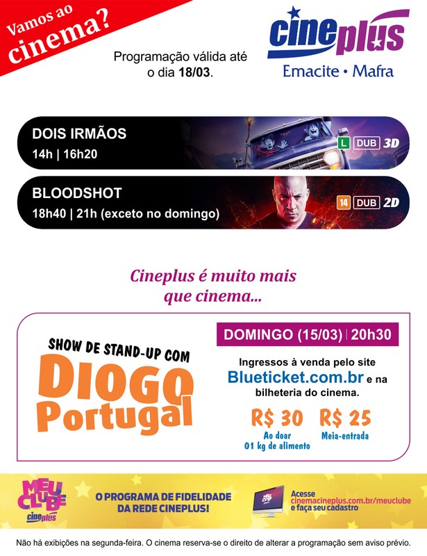 Sorteados na promoção. O ganhador pode ir ao cinema em uma das sessões desta sexta-feira (dia 13). Pode escolher um dos filmes da programação. Basta apresentar um documento de identificação e citar que foi sorteado(a) pelo Click Riomafra. O ingresso é individual e válido somente para este dia 13/03. Verifique sempre a classificação indicativa do filme. Bom filme! ;)