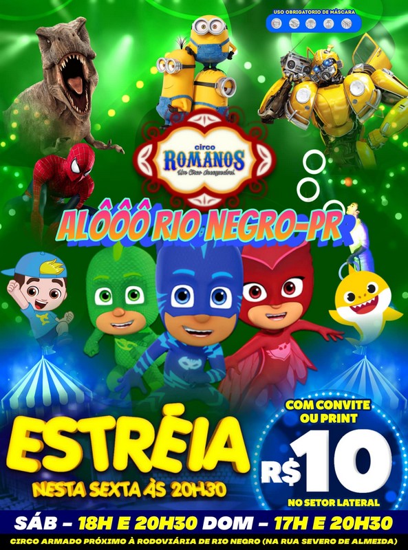O fabuloso Circo Romanos – o mais alegre do Brasil – está em Rio Negro com espetáculo completo do circo e diversas atrações infantis. Ele está armado na Rua Severo de Almeida, próximo da rodoviária, no bairro Campo do Gado.